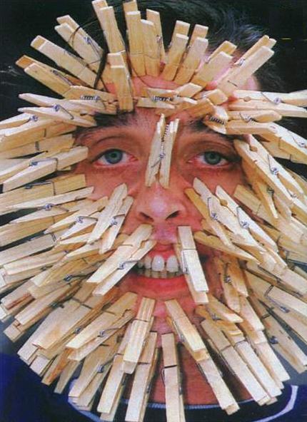 недавно ентот парень пришпандорил себе на физиогномию 165 прищепок