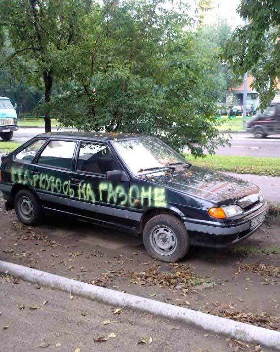 Вот уже несколько недель мы раскрашиваем машины тех долбо**ов, которые паркуются на газонах. Обычно просто пишем что-то вроде "Паркуюсь на газоне", "Паркуюсь на газоне. Гринбомберы" или типа того. Цель -- четко донести месседж и наказать автовладельца рублем. Да, это цинично, кто-то может посчитать это хулиганством, но это работает: по нашим наблюдениям, чтобы отвадить автомобилистов от конкретного газона, нужно всего 2-3 атаки. После этого на охраняемом нами газоне уже никто не осмеливается парковаться.