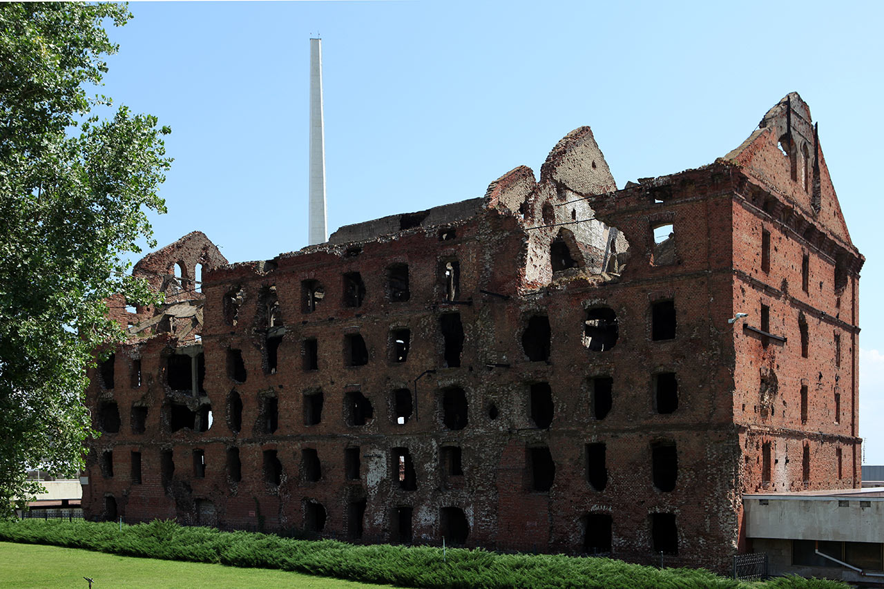 Мельницу слегка укрепили, но незаметно, изнутри. Всё остальное - как есть, даже рельефная надпись со стороны реки Волги. Можно вплотную подойти к зданию с одной, неогороженной стороны (на фото - справа), потрогать стену и понять, какой там был ад.
