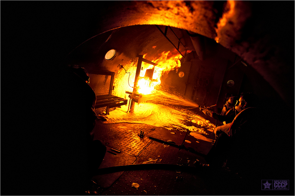 Это учебно-тренировочный комплекс ВМФ по отработке борьбы с пожарами. Т.е. ситуация сугубо учебная. По факту, лодки горят частенько, основные причины вездесущий человеческий фактор (падение уровня подготовки, халатность, незнание) и крайний износ техники. Тем не менее, развитие пожара до обозначенной на картинки ситуации, редкость, чаще успевают пресечь на ранней стадии возгорания.